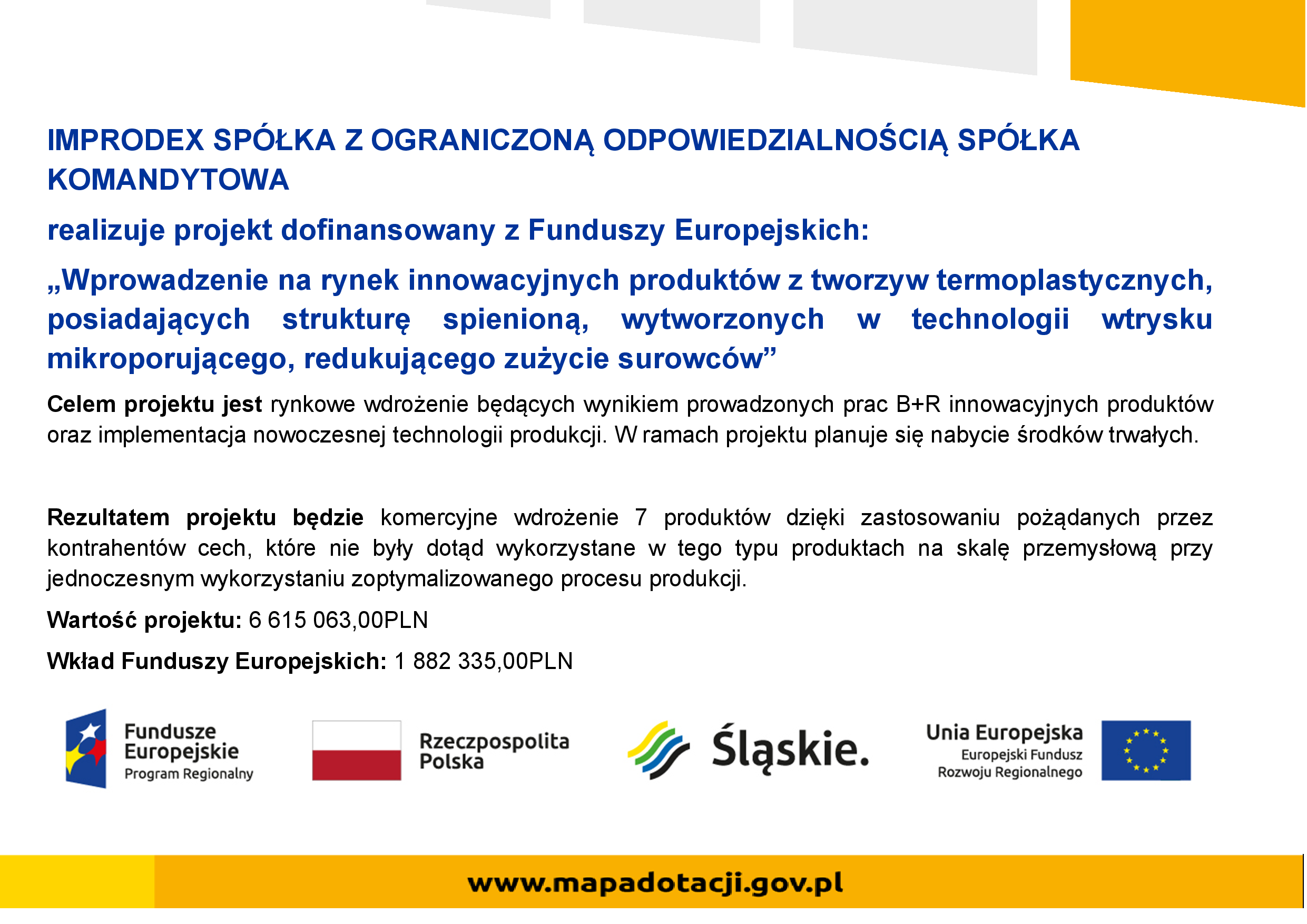 Firma IMPRODEX SPÓŁKA Z OGRANICZONĄ ODPOWIEDZIALNOŚCIĄ uzyskała dofinansowanie ze środków Unii Europejskiej w ramach Fundusze Europejskie dla Śląskiego 2021-2027 (Fundusz na rzecz Sprawiedliwej Transformacji) na realizację projekt „Wdrożenie energooszczędnej technologii produkcji z systemem wysokosprawnej kogeneracji i fotowoltaiką celem wprowadzenia na rynek form wtryskowych”.