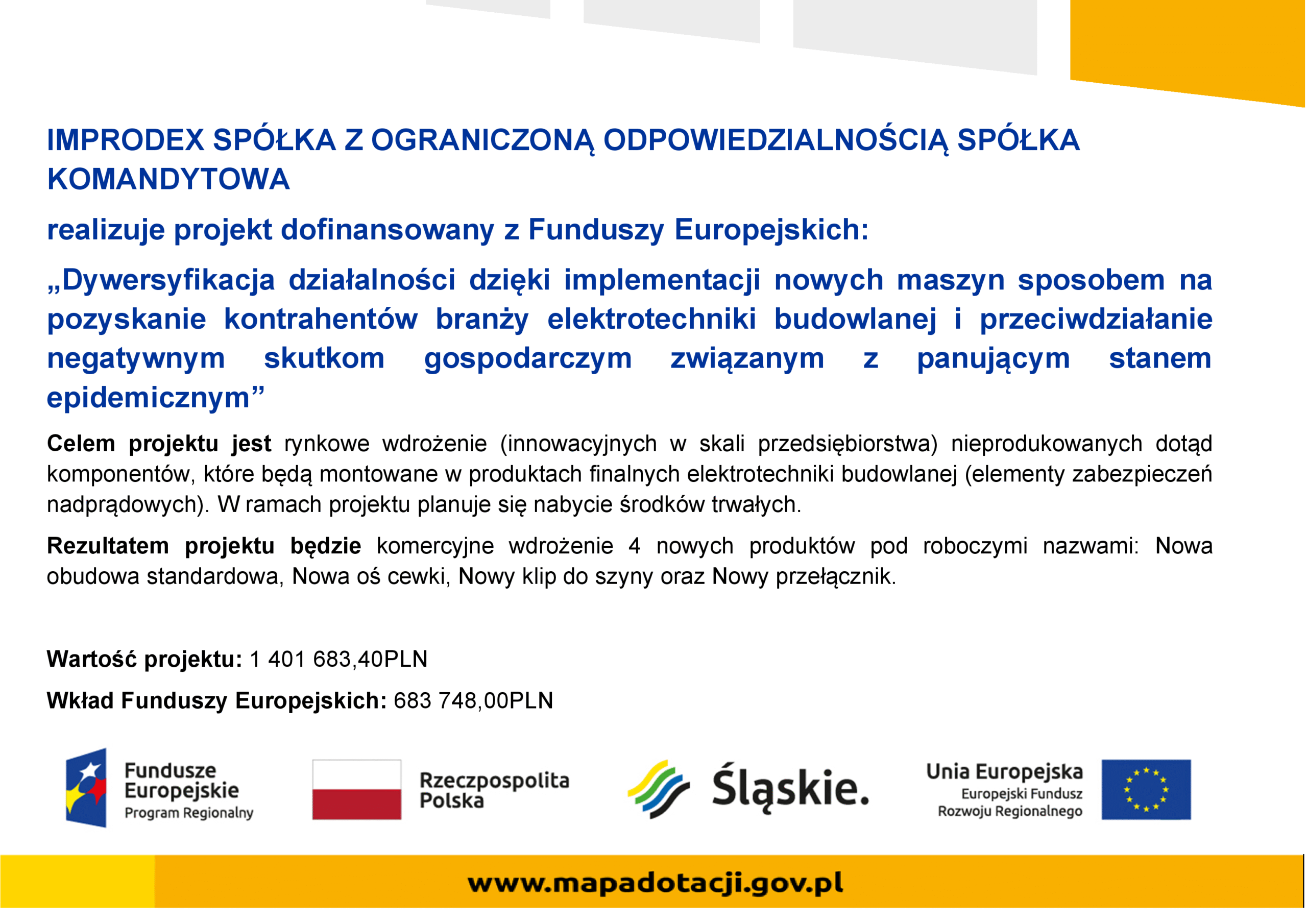 Firma IMPRODEX SPÓŁKA Z OGRANICZONĄ ODPOWIEDZIALNOŚCIĄ uzyskała dofinansowanie ze środków Unii Europejskiej w ramach Fundusze Europejskie dla Śląskiego 2021-2027 (Fundusz na rzecz Sprawiedliwej Transformacji) na realizację projekt „Wdrożenie energooszczędnej technologii produkcji z systemem wysokosprawnej kogeneracji i fotowoltaiką celem wprowadzenia na rynek form wtryskowych”.
